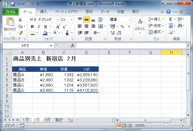例えば、1月から3月にかけて月ごとにシートを設け、商品ごとの売上を集計している表があるとする。