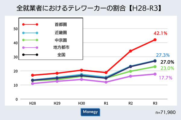 コロナ禍前の平成28年~令和元年までは、どのエリアもほぼ10%台。令和元年時点で最も高かった首都圏が18.8%(約5.3人に1人の割合)で、最も低かった地方都市圏は12.0%(約8.3人に1人の割合)、その差は6.8ポイントのみでした。しかし、令和3年は最も高かった首都圏が42.1%(約2.4人に1人の割合)で、最も低かった地方都市圏は17.7%(約5.6人に1人の割合)に。差は24.4ポイントに大きく広がりました。この結果を見ると、首都圏はコロナ禍前から23.3ポイントアップで2倍以上増加した一方、 地方都市圏は5.7ポイントのみアップ。コロナ禍でテレワークが浸透したのは主に首都圏だったということがわかりました。