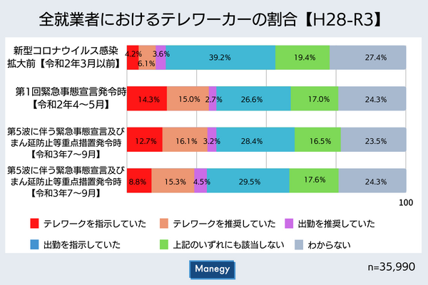 マネジーではこのたび、ポストコロナの働き方について考えるきっかけとして、「テレワークとワークエンゲージメント」をテーマにした特集記事を複数回にわたって提供していきます。第1回目は「コロナ禍の前後でこんなに変わった! 日本のテレワーク事情」です。