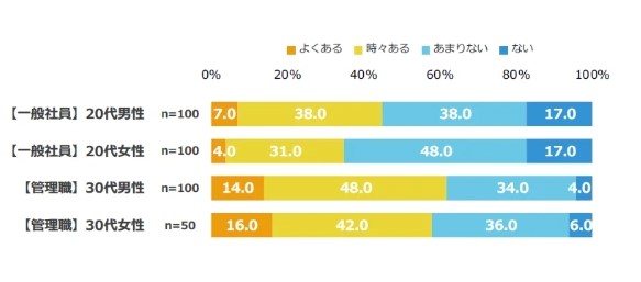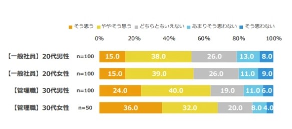 なお、「20代の一般社員」と「30代の管理職」に分けて調査しており、社内の立場や性差によって回答内容が異なる点にも注目してください。