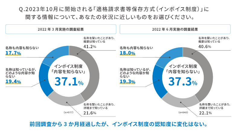 最初にインボイス制度の認知について尋ねた。結果は「名称は知っているが、どのような内容か知らない」と答えた企業が19.3%、「名称も内容も知らない」と回答した企業が18.0%となり、計37.3%がインボイス制度を知らなかった。今年3月の同調査でも同様の回答割合が37.1%となり、横ばいの状態であることが分かった。