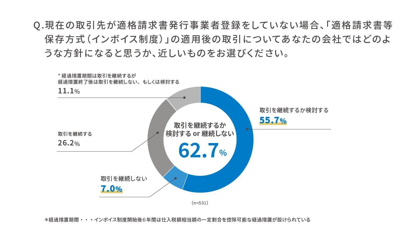 また、取引先が適格請求書発行事業者ではない場合のインボイス制度適用後の取引についての対応を聞いた。結果は「取引を継続しない」企業が7.0%、「継続するか検討する」企業が55.7%だった。