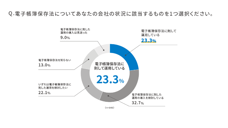 電子帳簿保存法の運用について尋ねたところ「電子帳簿保存法に則して運用している」と回答した企業は23.3%で、残りの76.7%の企業が運用できていないことが明らかに。
