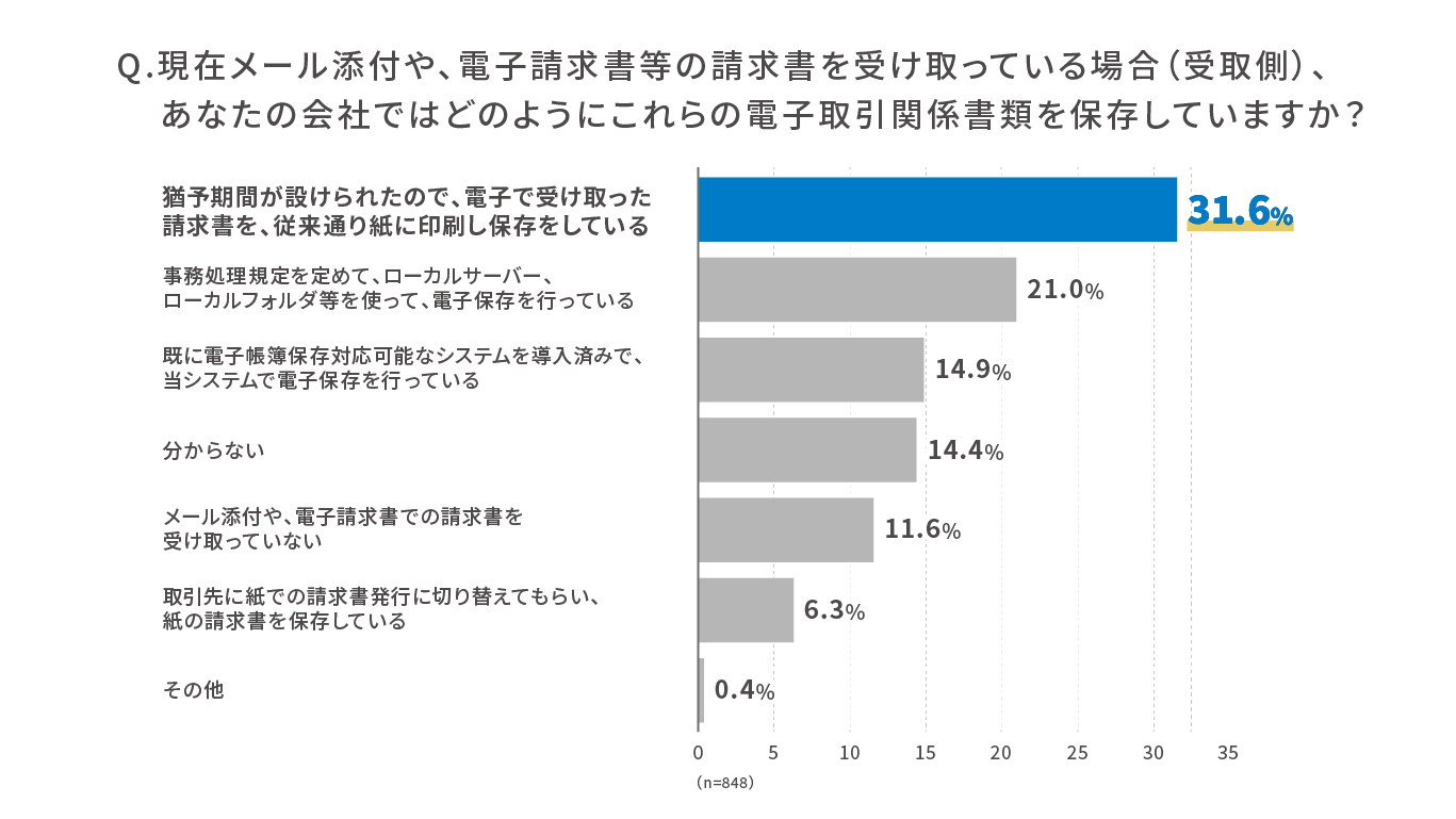 電子取引関係書類の保存方法に対しては、「猶予(※)期間がもうけられたので、電子で受け取った請求書を、従来通り紙に印刷し保存している」と回答した企業の割合が31.6%に。対応が先送りになっている様子が見えた。また「取引先に紙での請求書発行に切り替えてもらい、紙の請求書を保存している」と6.3%の企業が回答した。