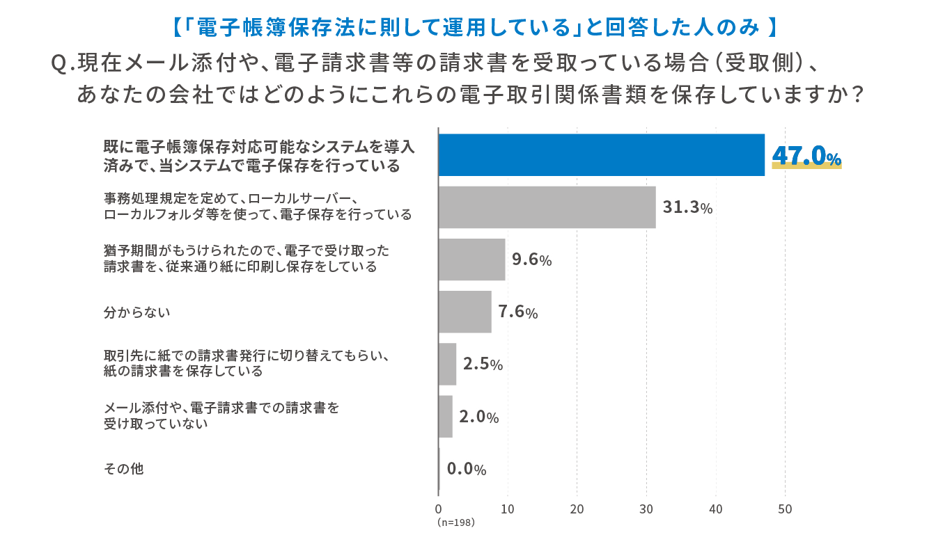 では、前述の「電子帳簿保存法に則して運用している」と回答した企業はどのように対応しているのだろうか。結果は「すでに電子帳簿保存対応可能なシステムを導入済みで、当システムで電子保存を行っている」と47.0%の企業が回答。対応が遅れている企業は、システム導入を検討してみるとよさそうだ。
