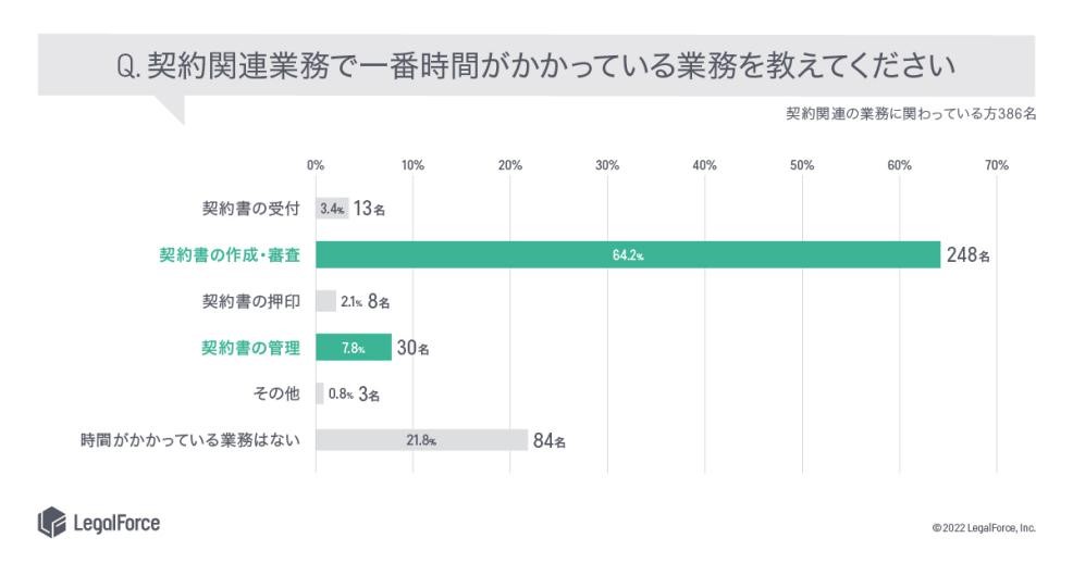 契約関連業務で最も時間がかかっている業務を尋ねた質問では、最多回答は「契約書の作成・審査」で64.2%だった。次に多かった「契約書の管理」は7.8%だったので、ほとんどの人は「契約書の作成・審査」で時間をとられているようだ。
