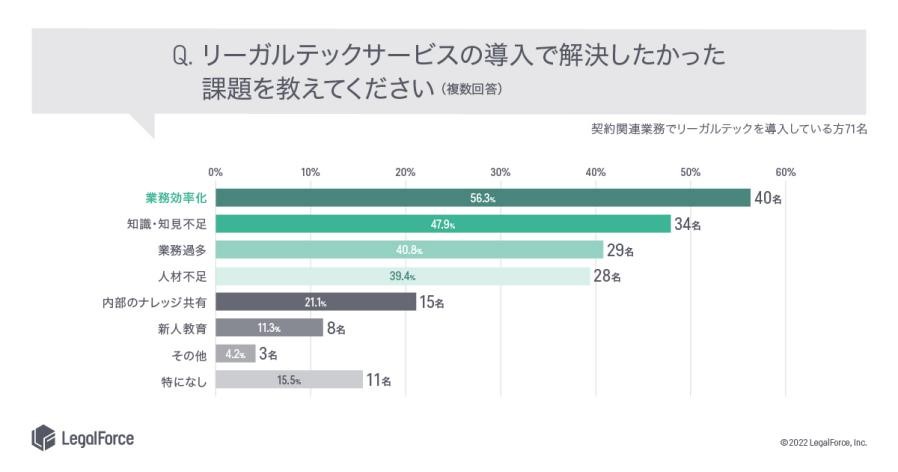 また、前問で「導入している」と回答した人を対象に、リーガルテック導入によって解決したかった課題を聞いた(複数回答可)。