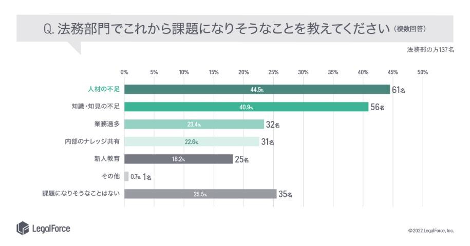 ・法務部門でこれから課題になりそうなことは「人材の不足」が44.5%。