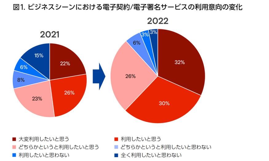また、回答者の8割以上が電子契約・電子署名サービスの利用意向を示し、特にビジネス面では88%が利用を希望している(昨年は71%)(図1)。