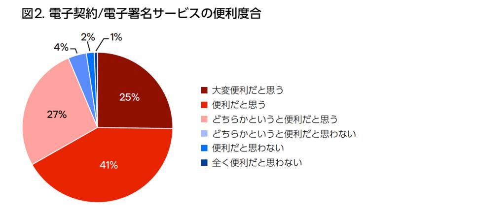 さらに、電子契約・電子署名サービス利用経験者の93%が「便利である」と回答し、4人に1人は「大変便利である」と評価(図2)。「印鑑が不要である」「場所を選ばずいつでもどこでも利用できる」「回覧中の文書の所在がわかる」などの理由で高く評価されている。
