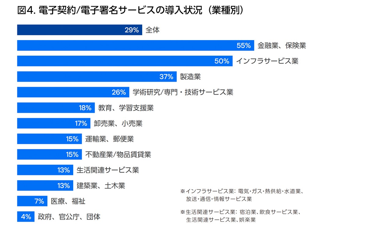 ・電子契約・電子署名サービスの企業・組織での導入率は、昨年の18%から29%と増加。最も導入率が高いのは金融業・保険業の55%。