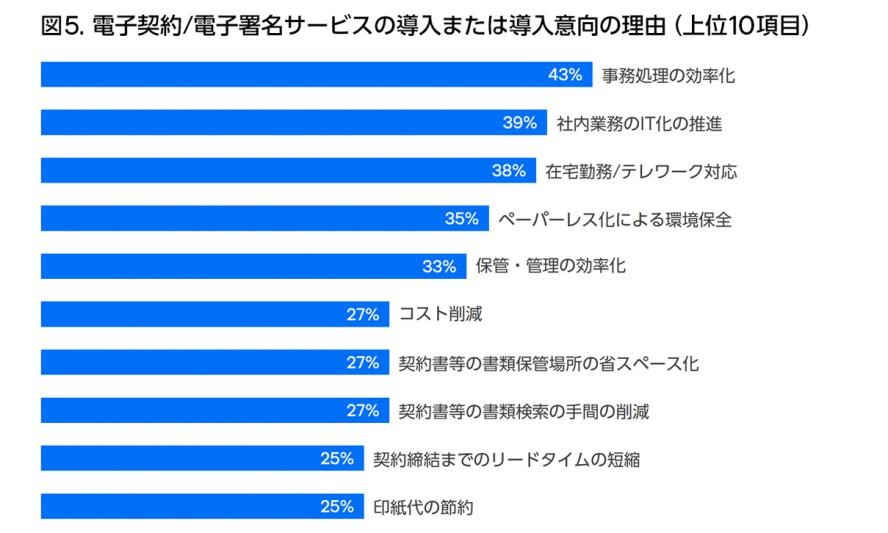 企業・組織による電子契約・電子署名サービスの導入・導入意向の理由は、最多回答が「事務処理の効率化」で43%(図5)。一方、導入済みの企業・組織の回答は「在宅勤務/テレワーク対応」が最も多い。コロナ禍で出社せずに契約業務を遂行できるようにすることが、電子契約・電子署名サービスの導入加速の大きな要因と考えられる。