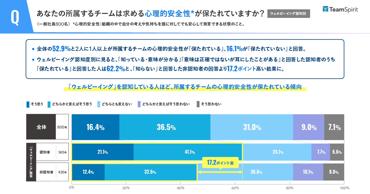 また、所属チームの心理的安全性(組織の中で自分の考えや気持ちを誰に対してでも安心して発言できる状態のこと)が保たれているかについても質問。