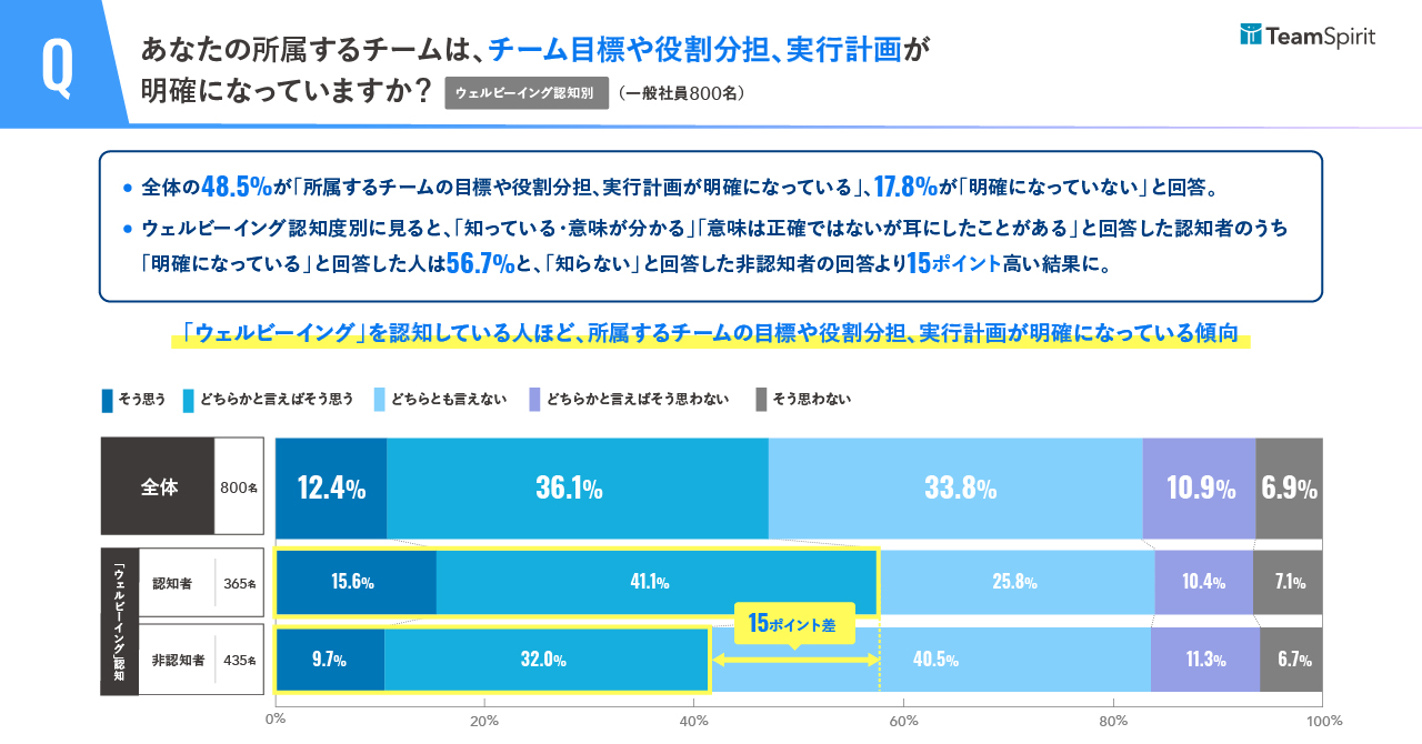 所属チームの目標や役割分担、実行計画が明確になっているかについては、「そう思う」「どちらかと言えばそう思う」と回答した人が48.5%で半分弱でした。