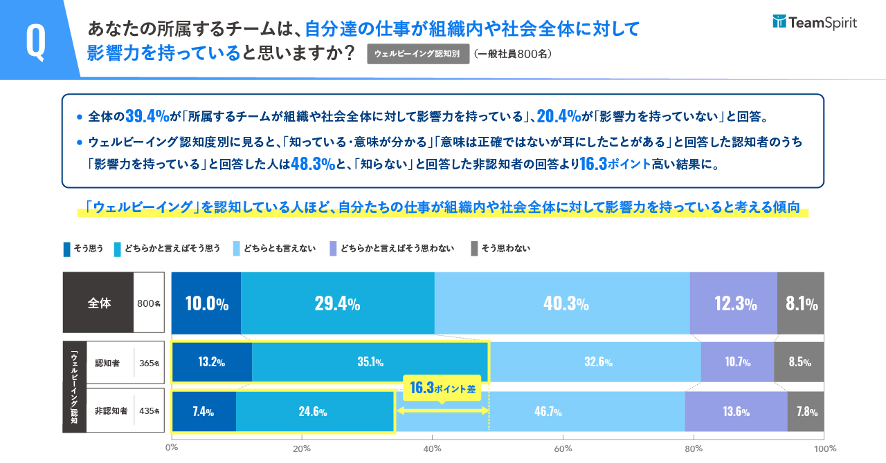 所属チームでの自分達の仕事が組織内や社会全体に対して影響力を持っているかについては、「そう思う」「どちらかと言えばそう思う」と回答した人が39.4%でした。