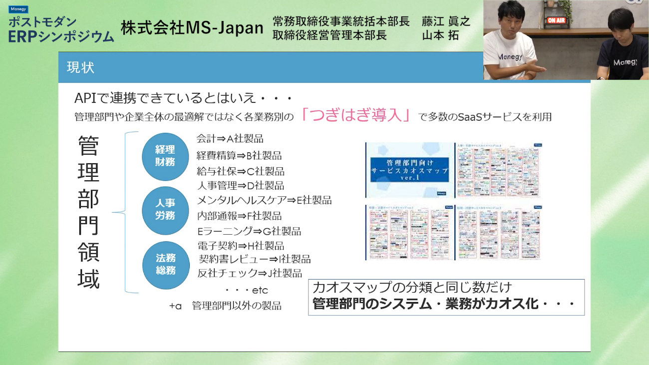 セッション前半では、SaaSサービス利用企業へのアンケート結果をもとに、リアルな企業の現状をご紹介。また、多数のSaaSサービスを併用する「つぎはぎ導入」によって、バックオフィス部門が直面している課題について解説しています。