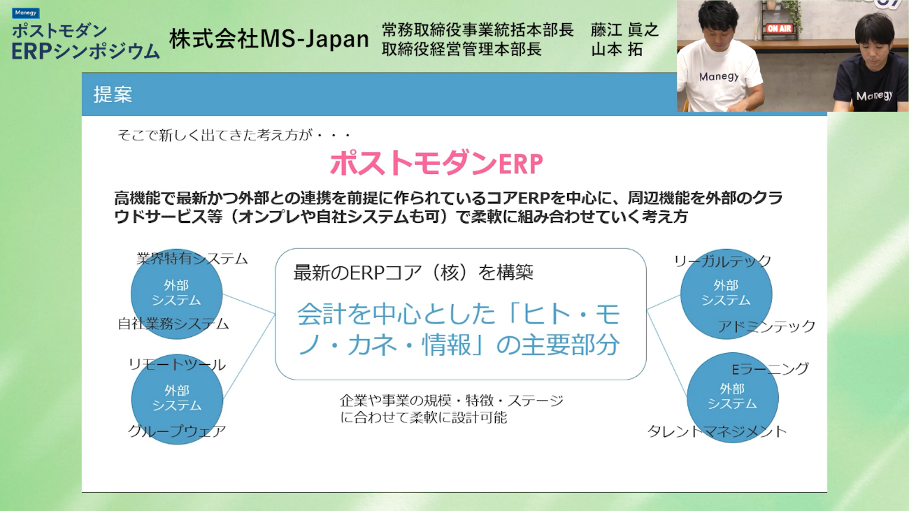 本セッションでは、国内におけるSaaSを導入している企業がどのような状況で、どう感じているのか?リアルな現状がわかるユーザーアンケートと共に、多数のシステム導入によって生じている課題を解決するポストモダンERPの考え方について、株式会社MS-Japanの新旧経営管理本部長である藤江氏と山本氏が解説しました。