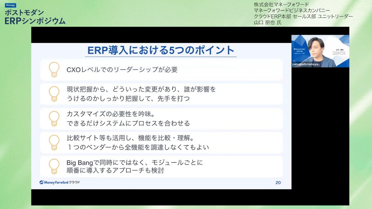 本セッションでは、ポストモダンERPの導入にあたり、サービスの比較検討から導入・運用までに必要な具体的な検討事項や注意ポイントについて、導入する際のイメージを持っていただけるよう、マネーフォワード社のERP本部に所属する山口氏に解説していただきました。