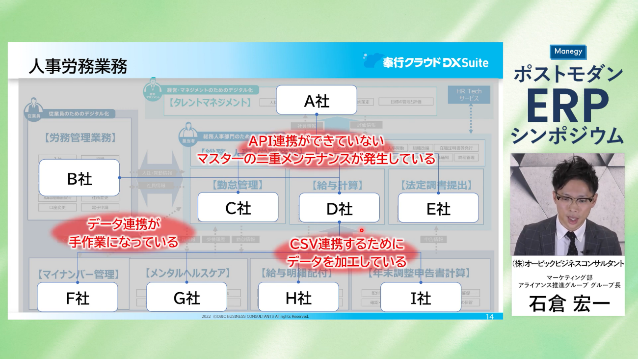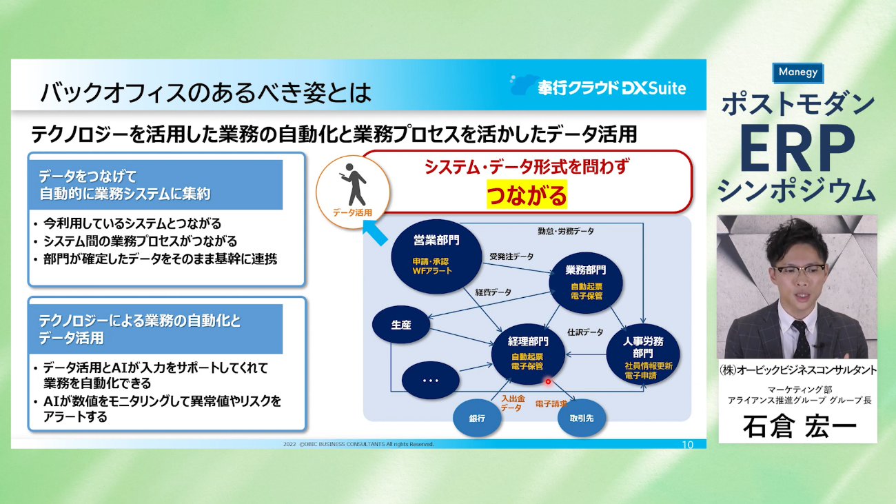 本セッションでは、この環境を実現するため、クラウドERPサービスを利用することで、バックオフィス業務の何が変わるのか、効率化されるのか、奉行クラウドで実現するポストモダンERPを、オービックビジネスコンサルタント社の石倉氏に解説していただきました。