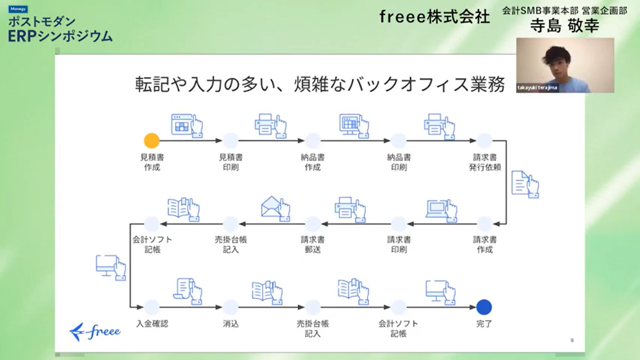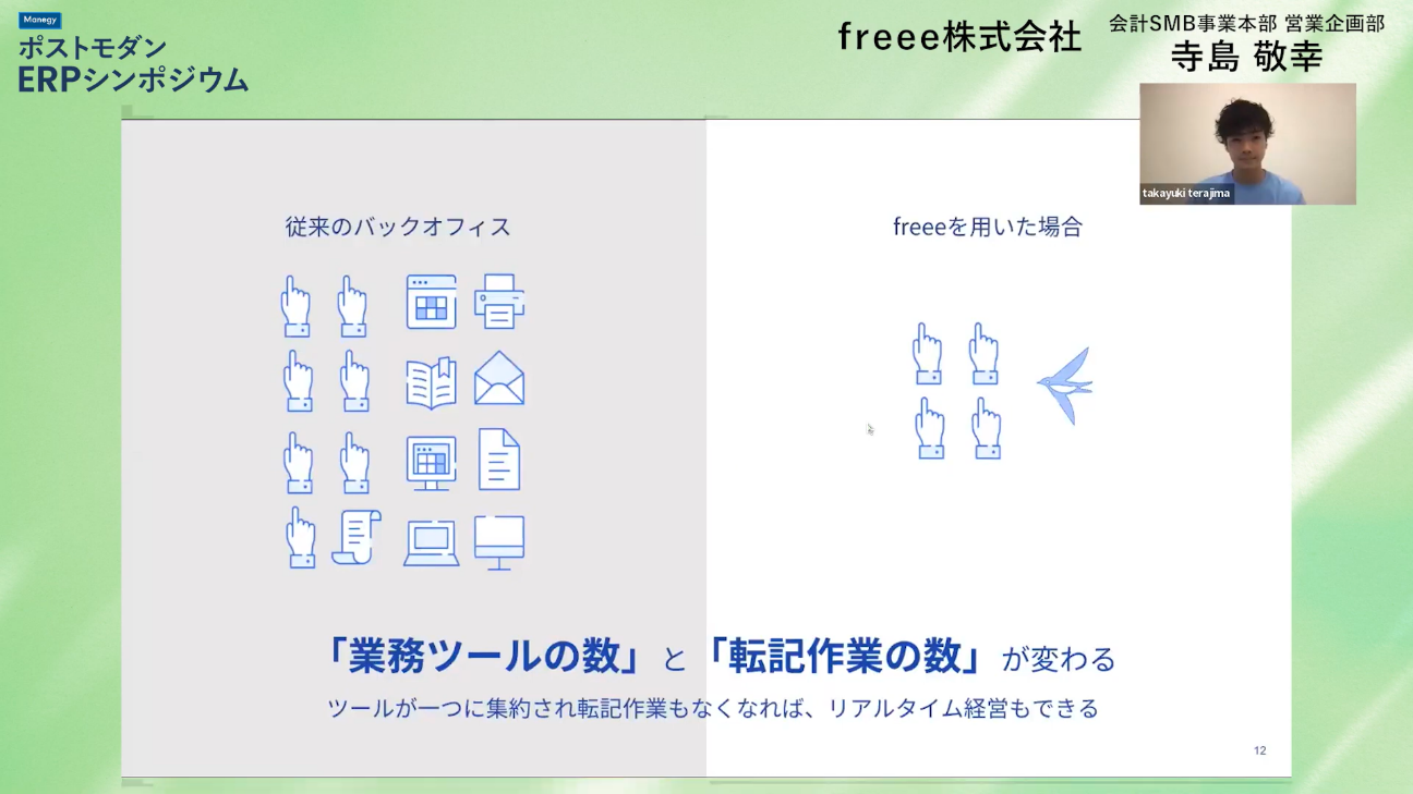 本セッションでは会計SMB事業本部に所属する寺島氏に、freeeのデモンストレーションを交えながら『統合型』の概念とメリットについて解説して頂きました。