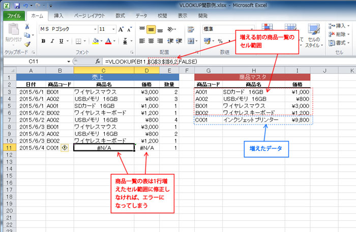 例えば、商品一覧の表のセル範囲が元々はG3~I6セルであったが、商品が1点増えて1行増えG3~I7セルになったとする。その場合、売上データの表のC列およびD列のVLOOKUP関数では、第2引数のセル範囲が元のG3~I6のままでは、新たに増えた商品が検索対象から外れるのでエラーとなってしまう。