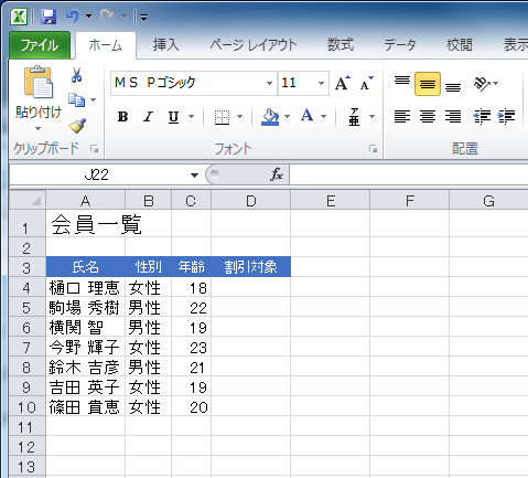 例えば、次の画面のように、氏名と性別と年齢のデータがA4~C10セルに入力された会員リストがあるとする。ここで、女性であり、なおかつ、20歳未満かどうかを会員ごとに判定したいとする。そして、判定結果はF4~F10セルに、TRUEまたはFALSEで表示するとする(TRUEは条件が成立、FALSEは不成立を意味する特別な値)。