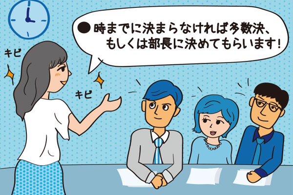 具体的には、会議中盤で参加者に会議の中盤でこのように投げかけてみましょう。「会議終了5分前まで議論して、それでも決まらなければ、多数決、もしくは部長に決めてもらうかどちらかで決めましょう」などと、進行役がかじ取りをしましょう。会議終了ギリギリになってからでは慌しいですし、会議の冒頭から「結論の出し方をどうしましょうか」などと言ってしまうと「あの進行役は会議を早く終わらせたがっている」というような印象を与えかねません。