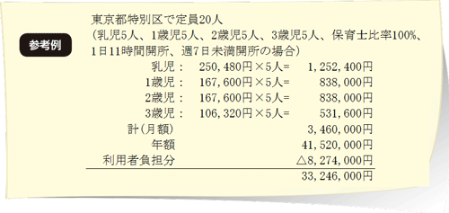 例えば、都市部で定員20人の施設を新設する場合、設立資金に約1億円程度、運営費用に約3千万円の助成金が支払われます(※入園者の年齢、保育士比率、開所日数等により助成金額が変わります)
