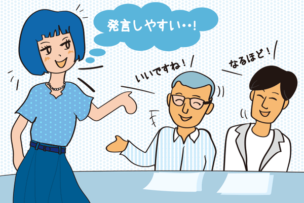 会議の重苦しい空気をほぐすコツは、「笑顔・うなずく・褒める」の3つ。まずは、ニコニコ笑顔を心がけましょう。自然な笑顔が難しいという人は、口角(唇の両端)を軽く上げてみると、ニッコリした柔らかい表情になります。