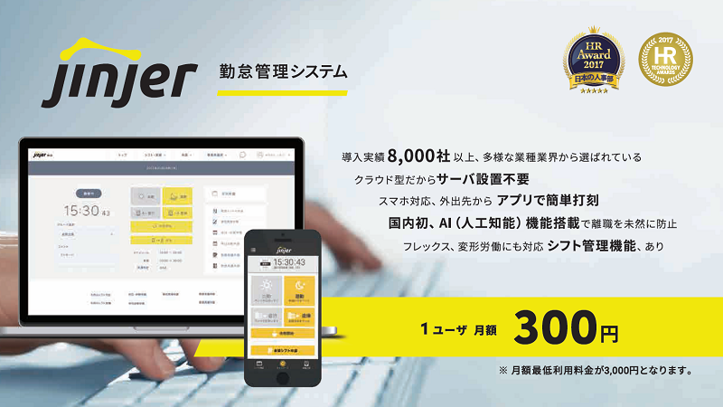 「jinjer勤怠」は労働時間の集計や各種申請、承認業務から有休や残業時間の管理まで、リアルタイムで一括管理致します。