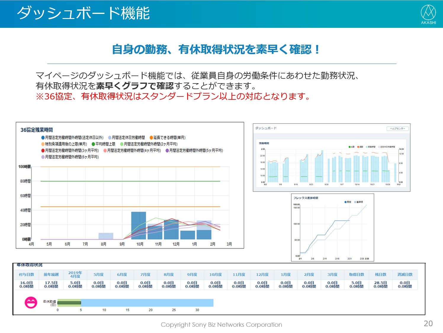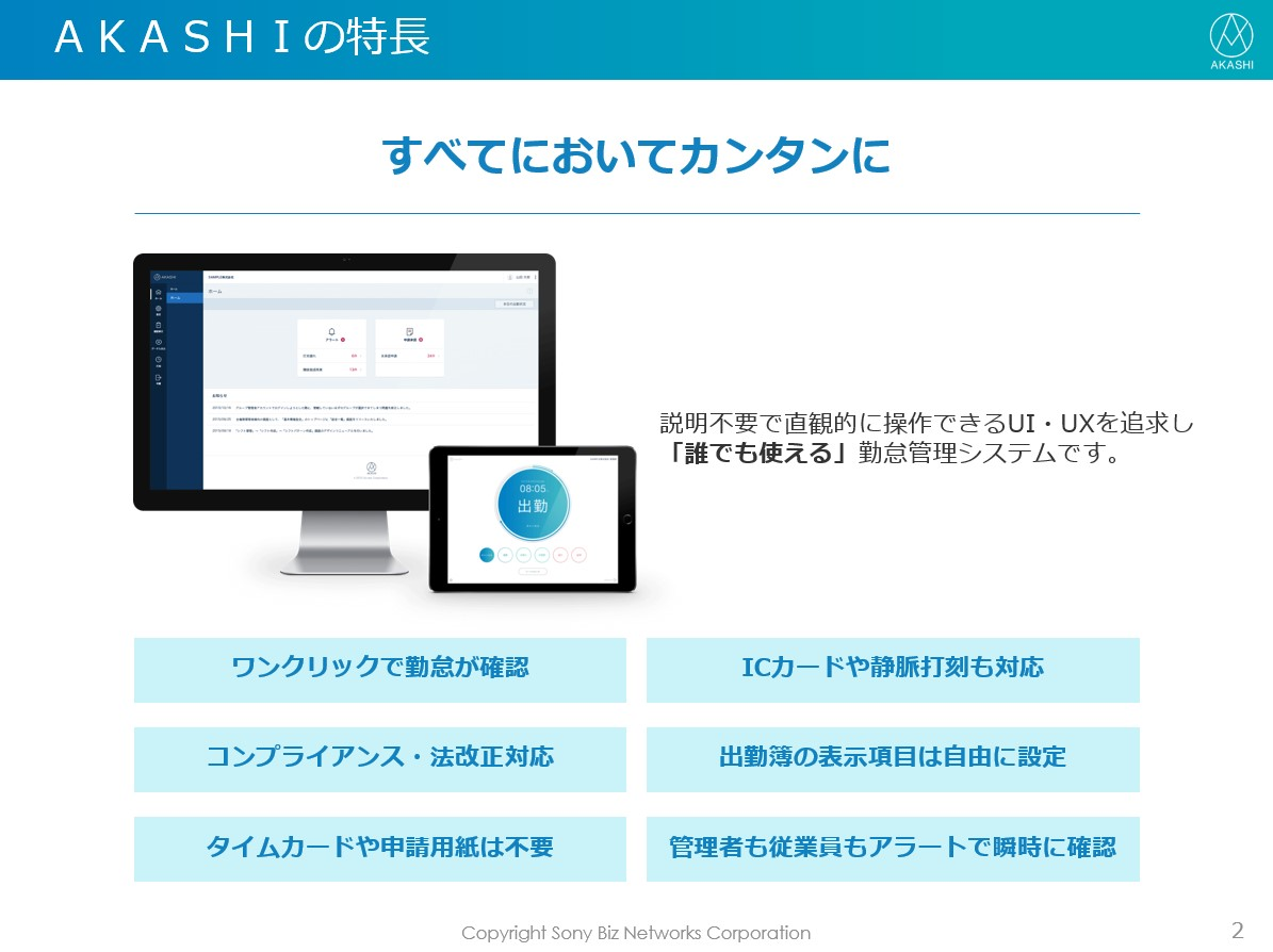 クラウド型勤怠管理システム「AKASHI」は、洗練されたシンプルでわかりやすいデザインで誰でも簡単に勤怠管理が出来ます。あらゆる法改正や複雑な就業ルールに対応し、テレワーク中の従業員をリアルタイムで確認できる 「テレワーク機能」や「シフト管理機能」「工数管理機能」など様々な機能を使って業務を効率化できます。