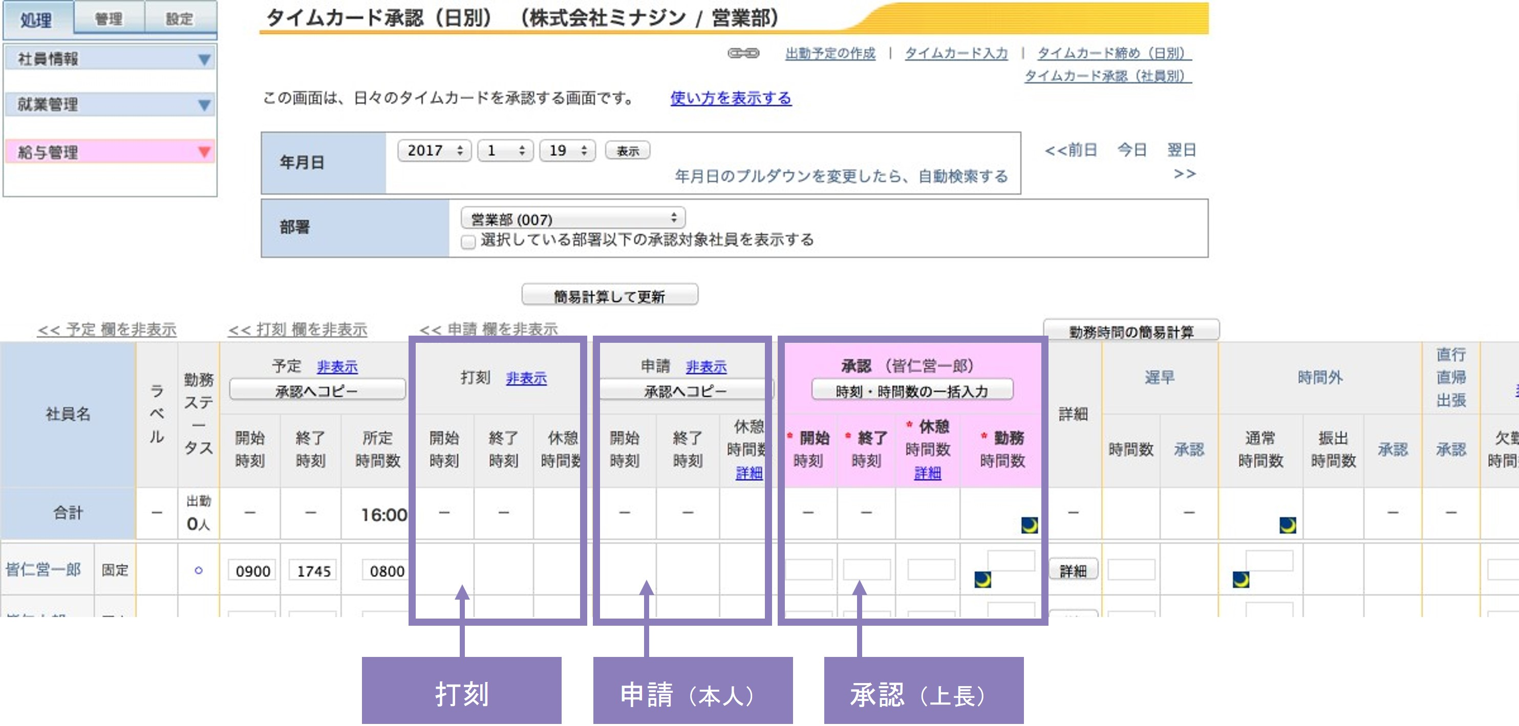 「打刻」「申請(本⼈)」「承認(上⻑)」の時刻を別々に管理できます。そうすることで、「実際の打刻時刻」と「⼊⼒・修正した時刻」に差異が⽣じた場合、アラートを出すことが可能なため、打刻の上書き、打刻の改ざんを防ぎます。