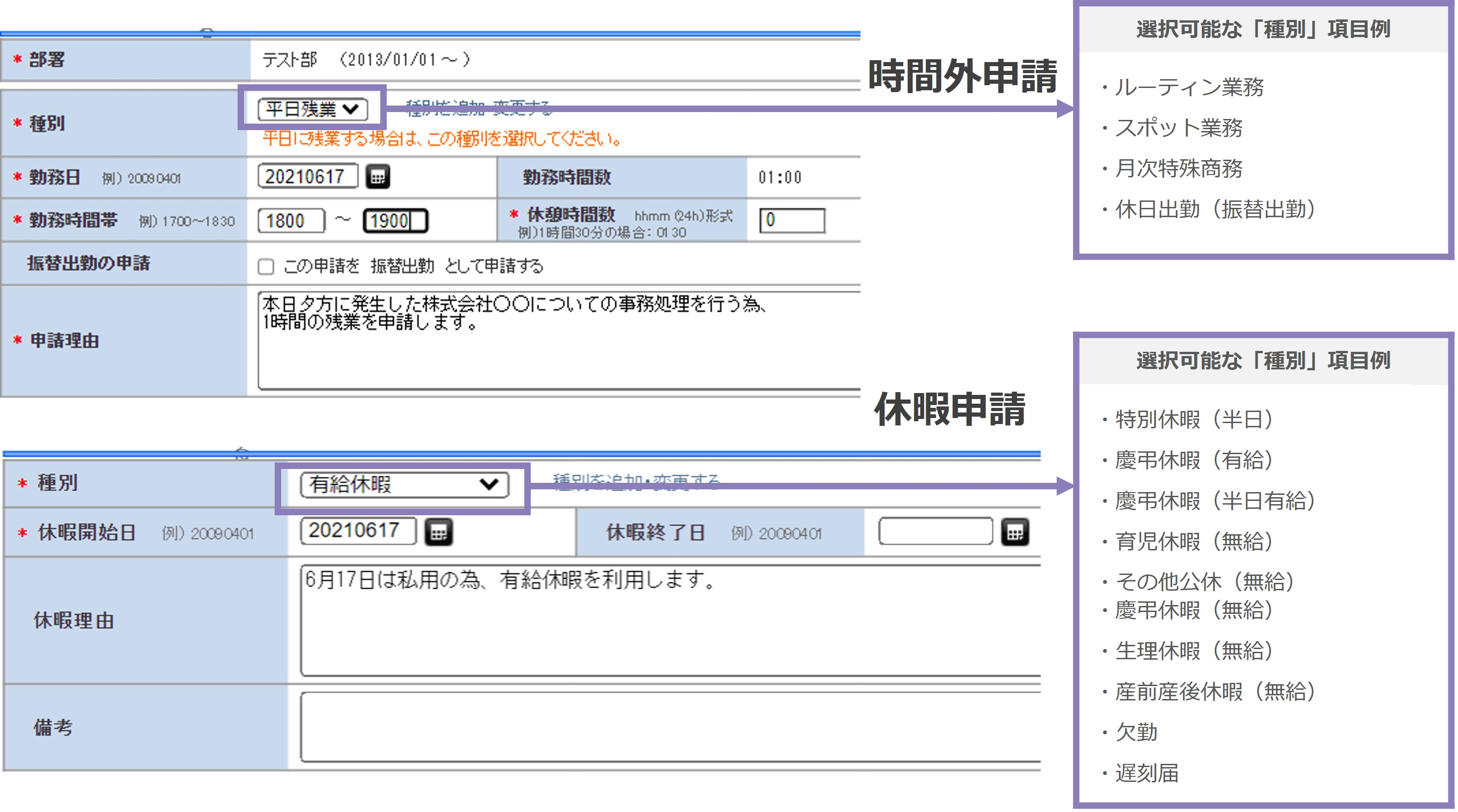 個社の就業ルールを反映できるよう、休暇設定や時間外申請など各種申請が無制限に作成可能で、項目名もカスタマイズ可能です。