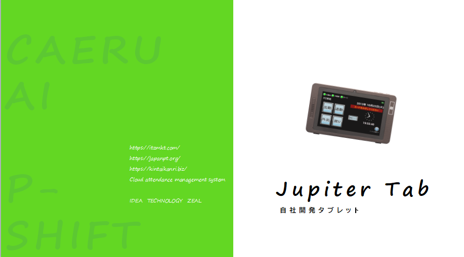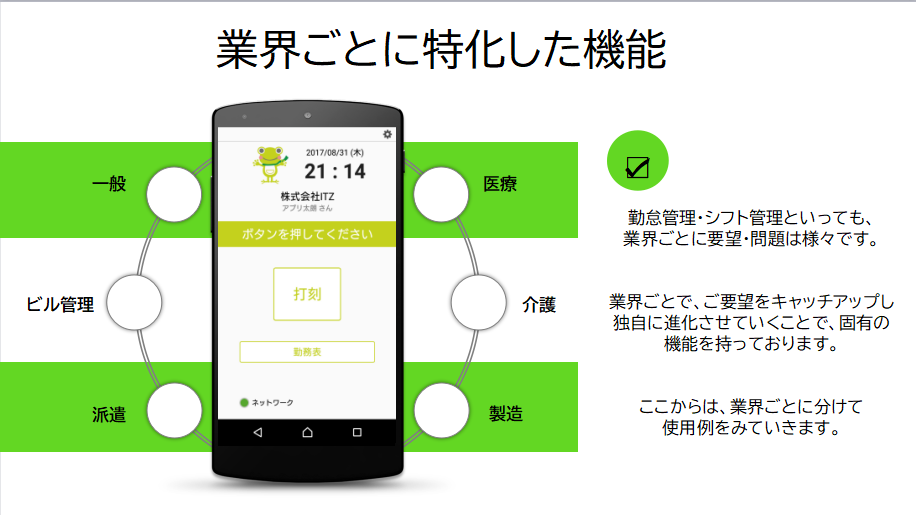 | 機能・仕様 | 勤怠管理 / 予実管理 / 集計カスタマイズ / チェックリスト機能 / シフト管理 / 有給管理 / ワークフロー / マルチデバイス打刻 |