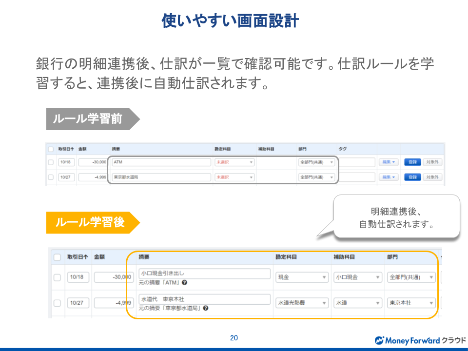 ●明細データの自動取得・明細データの自動仕訳・仕訳ルールの自動学習により経理業務を効率化