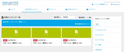 eラーニングプラットフォーム「SAKU-SAKU Testing」用の動画や問題集教材を、パッケージ化し、入社1年目~3年目、マネージャー教育を効果的・効率的に実施できるeラーニングサービス。 10IDからご利用可能で、受講管理も簡単です。