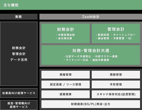 | 機能・仕様 | 伝票入力 / データ連携 / 各種帳票出力 / 消費税関連 / 月次関連設定 / 本支店会計 / 予算管理 / 外貨管理 / 配賦処理 / 資金管理 / キャッシュフロー / 会社合算 / 分析BIツール / 債務管理 / 債権管理 / 手形管理 / 固定資産管理/リース資産管理 |