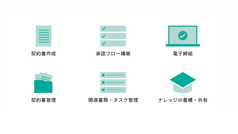 | 機能・仕様 | 契約書作成 / 承認フロー構築 / 電子締結 / 契約書管理 / 関連書類・タスク管理 / ナレッジの蓄積・共有 |