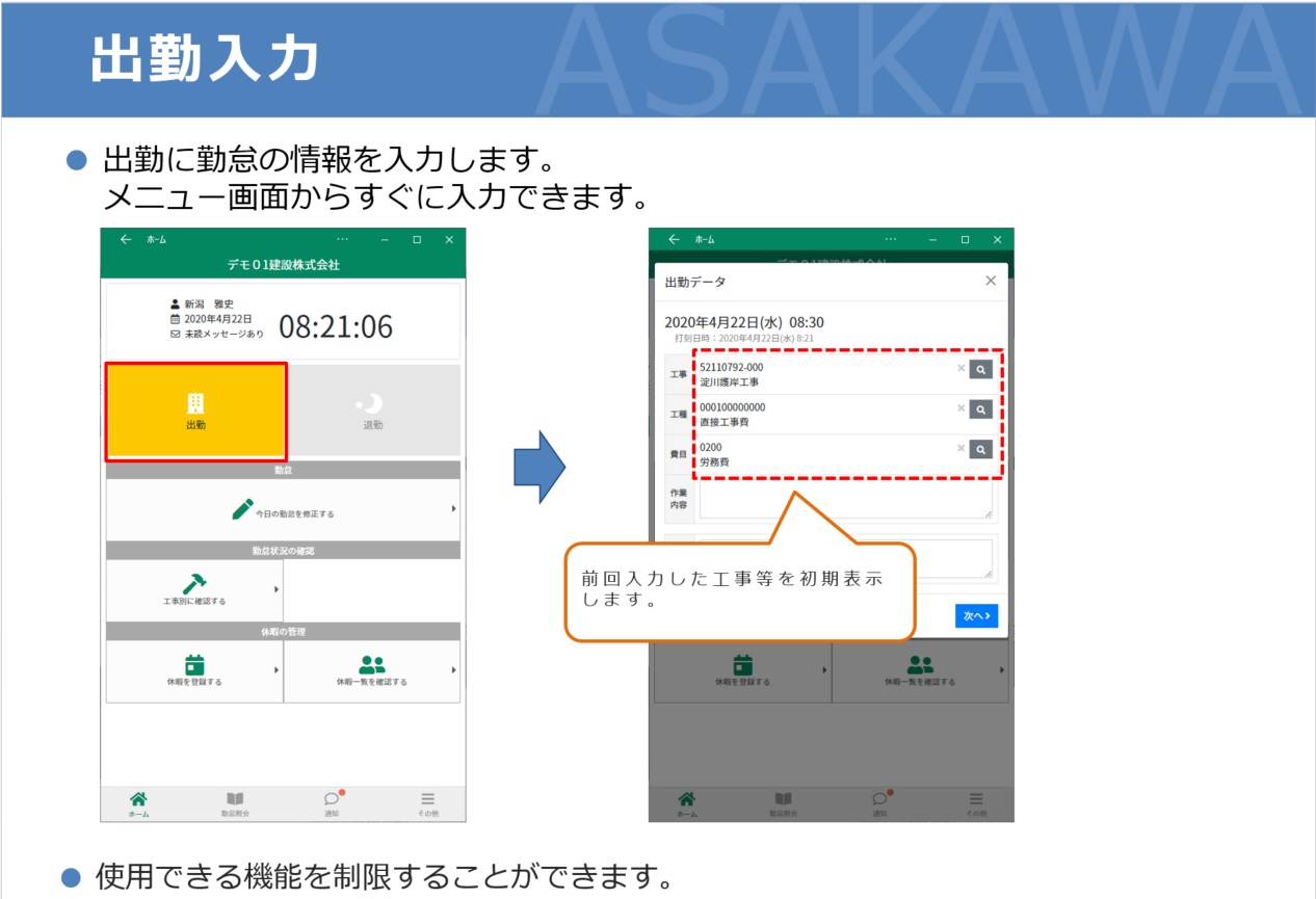 スマホを利用した勤怠管理システム ・現場への入退場打刻 ・工事ごとの勤怠(工数)入力 ・出勤簿への連携