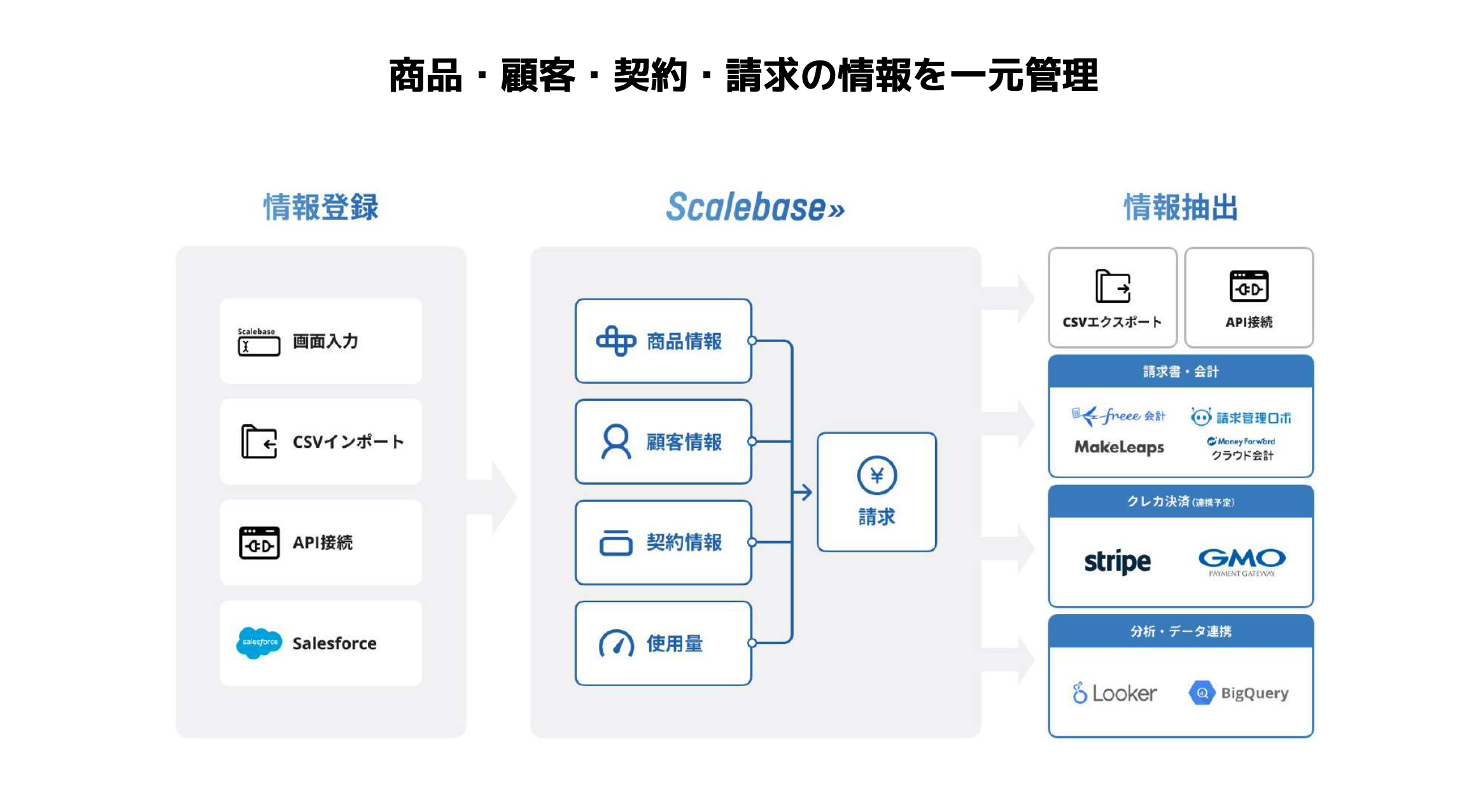 | 連携サービス | freee 会計 / マネーフォーワード クラウド会計 / 請求管理ロボ / MakeLeaps / salesforce / クラウドサイン / Looker / BigQuery |