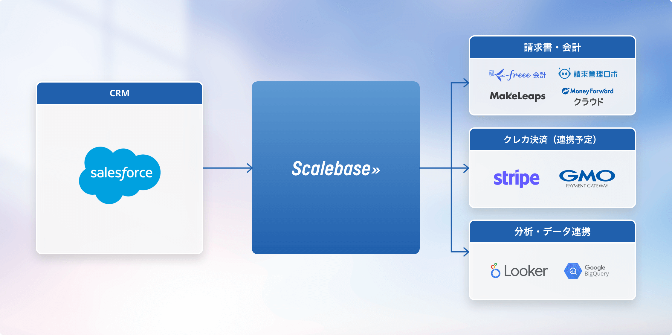 ScalebaseはサブスクリプションビジネスやSaaSなどの、継続収益ビジネス向けの販売・請求管理SaaSです。 プライシング設計・商品管理・顧客管理・契約管理・請求管理・指標分析・前受金管理・仕訳作成など業務オペレーションが一元管理できることで業務負荷を低減し、継続収益ビジネスの自由度をあげ、収益成長を支援します。