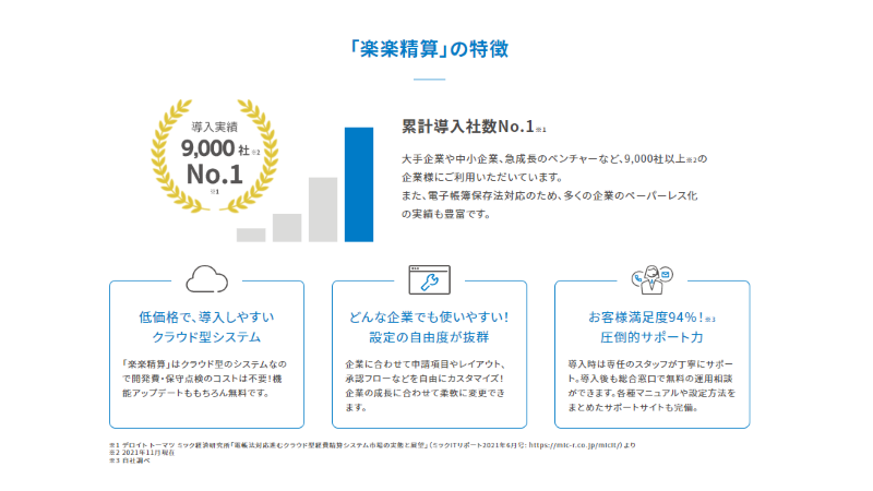 ※累計導入社数No1出典元:デロイト トーマツ ミック経済研究所「電帳法対応進むクラウド型経費精算システム市場の実態と展望」(ミックITリポート2021年6月号: https://mic-r.co.jp/micit/)より