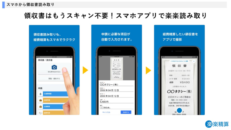 ┗領収書をスマホで撮影するだけで金額や取引日を自動で文字を認識。そのまま精算できる!