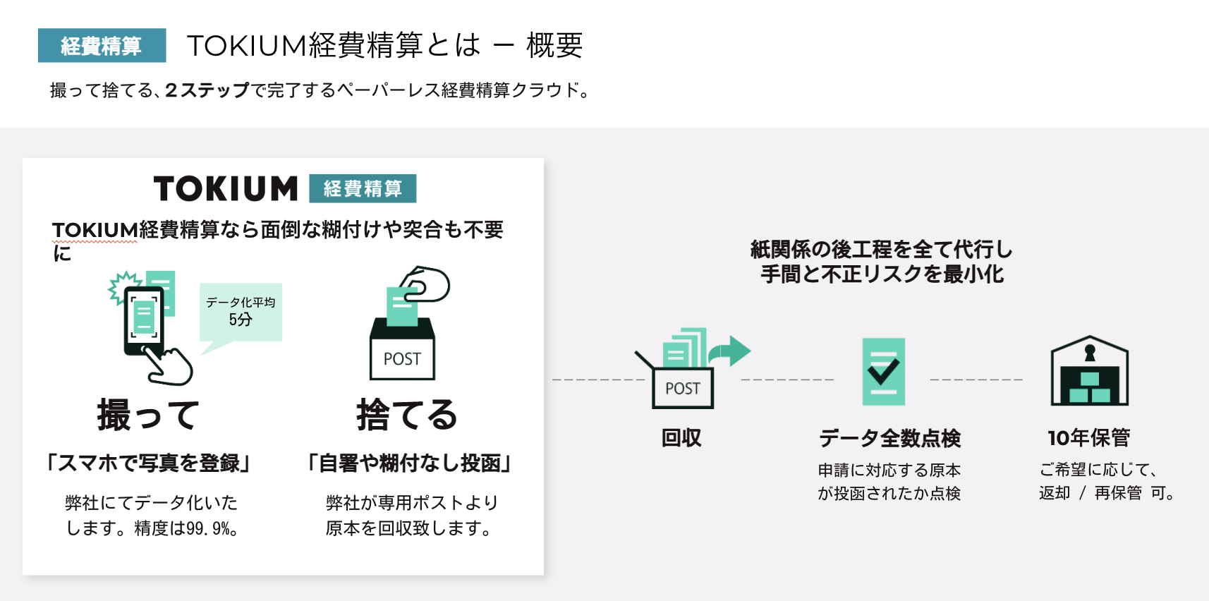 投函された領収書は、TOKIUMが回収。経費申請データ・領収書原本の突合点検を実施。保管、一定期間経過後の廃棄までを代行します。