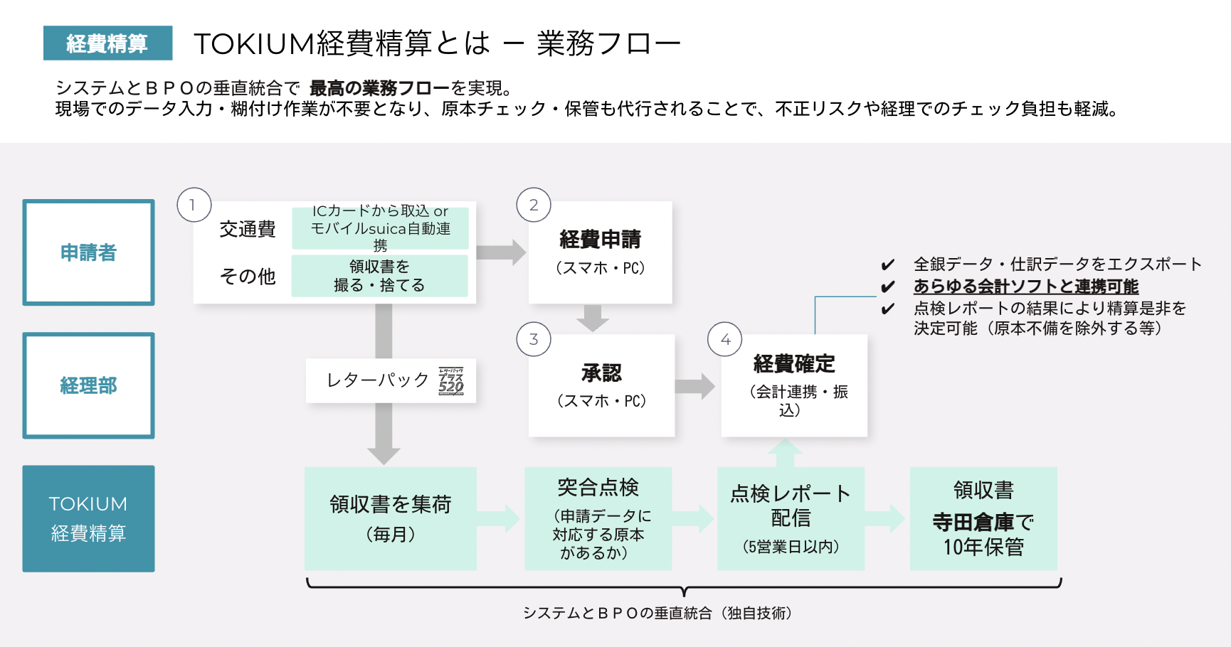 | 機能・仕様 | 領収書原本の回収 / 申請データとの突合点検 / 領収書の保管代行・廃棄 / 交通系ICカード取込み / モバイルSuica/PASMO / 法人カード連携 / 会計ソフト連携 / 電子帳簿保存法 |