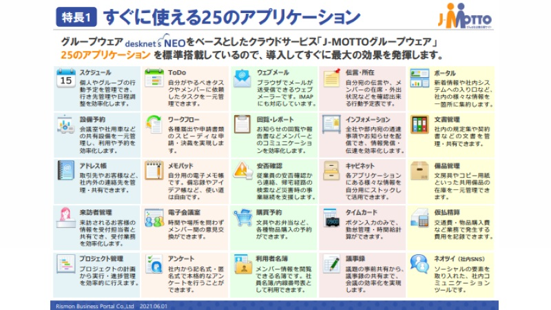 【中小企業にオススメ!】使って便利な25機能が標準装備!『J-MOTTO』は、日本最大級の導入実績を誇るグループウェア「desknet’s NEO」を元に同等の機能を提供するASP・クラウドサービスです。最大3ヶ月間! ご導入前に無料トライアルでじっくりお試しいただけます。