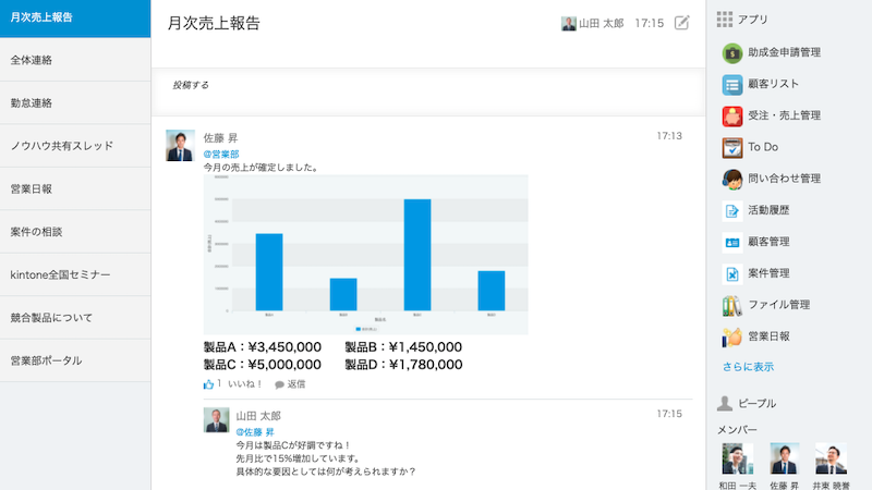 kintoneでは、チームでの業務を円滑に進めるべく、コミュニケーション機能が充実しています。各データの詳細画面にはコメント欄が付随しており、そのデータに紐づいたコミュニケーションが可能です。また特定のメンバーだけが参加する「スペース」、そして議論のテーマごとに議論の場を作れる「スレッド」機能により、チーム内でのコミュニケーションが整理され、情報格差が生まれません。