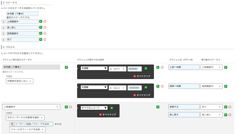 kintoneにはプロセス管理機能も備わっています。各業務システム(アプリ)について申請プロセスを自由に設定でき、そのプロセスに沿った進捗管理が可能です。申請プロセスについては、登録内容によって条件分岐させるなどの細かい設定も可能で、現在のチームの業務ステータスを正確に一元管理することができます。