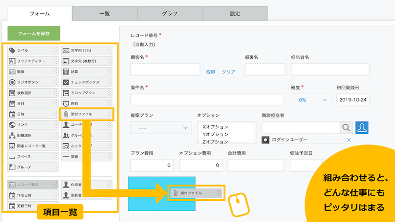 kintoneでは、専門知識なしで業務システムをドラッグ&ドロップでかんたん作成することができ、また修正も容易です。仕様書を作成し、高額なコストと長い納期が必要だった従来のシステム開発の流れは不要で、現場から上がってきた要望やアイデアをすぐに形にすることができます。