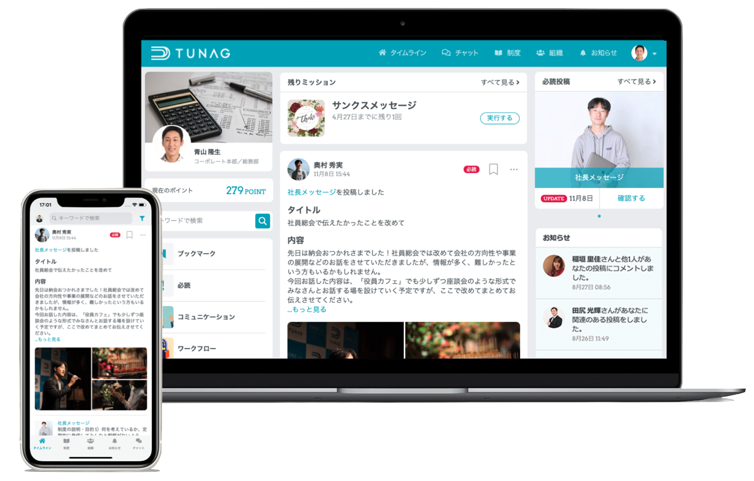 会社からの情報発信、現場の業務報告や情報共有、チャット、コミュニケーション活性化までこれ一つ。スマホアプリで利用でき、現場の従業員一人一人と双方向のやり取りが可能。エンゲージメント経営プラットフォーム「TUNAG(ツナグ)」